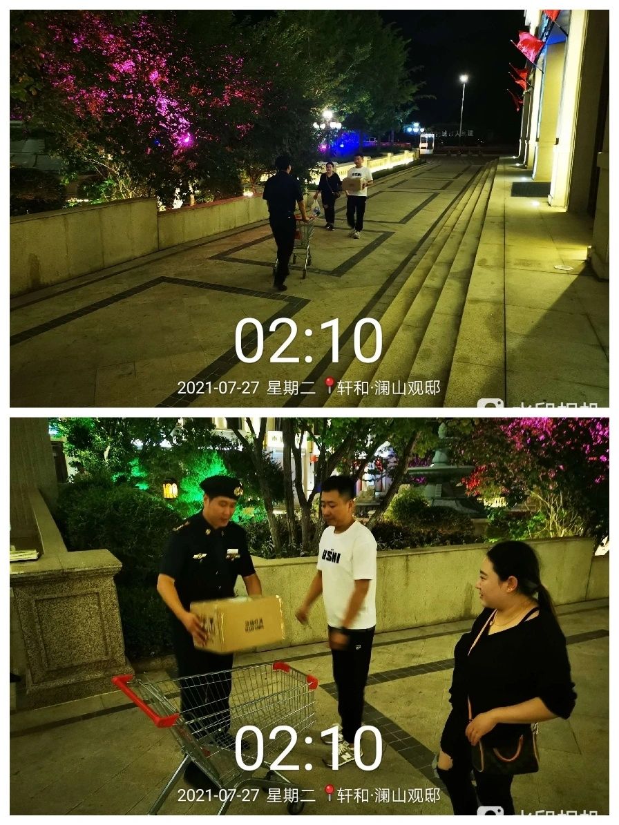 凌晨2:10夜間形象崗秩維員看到晚歸的業(yè)主抱著重物,馬上推著愛心車去幫忙拿東西,希望我們的一個(gè)舉動(dòng)一句問(wèn)候,能給晚歸的您帶來(lái)一絲溫暖,卸掉一絲疲憊!
